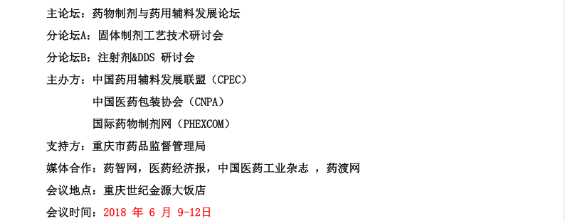 國(guó)家不斷深化藥品審評(píng)審批改革,推進(jìn)藥品全生命周期管理,全面落實(shí)藥品質(zhì) 量安全責(zé)任,針對(duì)性地進(jìn)行生產(chǎn)工藝核查,我國(guó)醫(yī)藥產(chǎn)業(yè)面臨供給側(cè)結(jié)構(gòu)改革的任 務(wù)。藥品審評(píng)審批制度改革方向是簡(jiǎn)化審評(píng)審批程序,鼓勵(lì)創(chuàng)新,突出藥品上市許 可持有人(MAH) 主體地位。通過簡(jiǎn)化審評(píng)、鼓勵(lì)創(chuàng)新、MAH 制度和藥品全生命周期 管理等監(jiān)管思路和理念統(tǒng)籌思考藥用輔料藥包材與藥品關(guān)聯(lián)審評(píng)審批制度。選擇和 使用藥用輔料、藥包材應(yīng)由藥品上市許可持有人(制劑企業(yè))基于制劑特點(diǎn)來判斷, 進(jìn)而系統(tǒng)評(píng)價(jià)藥品的安全有效穩(wěn)定。總局將加快藥包材藥用輔料登記平臺(tái)建設(shè),進(jìn) -步完善和細(xì)化相關(guān)政策。為更好的推進(jìn)藥品全生命周期的管理,促進(jìn)中國(guó)藥物制 劑的快速發(fā)展,《第六屆PhExFEST 中國(guó)藥物制劑節(jié)&暨2018中 國(guó)制藥科學(xué)家大會(huì)》 將于6月上旬在重慶舉行。屆時(shí)將邀請(qǐng)總局有關(guān)部門、中檢院、藥典委員會(huì)、科研院 校、制劑研發(fā)CRO、藥輔和設(shè)備儀器企業(yè)的專家作主題報(bào)告。熱誠(chéng)歡迎藥物制劑生產(chǎn)、制劑研發(fā)、制藥設(shè)備、分析儀器、藥用輔料及包材等企業(yè)代表和科研高校師生參 加本屆大會(huì)。