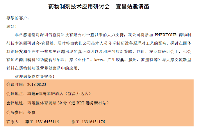 非常感謝您對深圳信宜特科技有限公司一直以來的大力支持,我公司將參加PHEXTOUR藥物制 劑技術巡回研討會宜昌站,屆時將由我們公司技術人員分享制藥設備原理對工藝的影響,探討在固體 制劑研發(fā)和生產中一些常見問題出現(xiàn)的真正原因以及相應的應對策略。同時,在此次研討會上,也會 有知名藥用輔料和功能食品配料廠家(亞什蘭、kenry、 廣生膠囊、贏創(chuàng)、羅蓋特等)與大家交流新型 輔料在藥物制劑及營養(yǎng)健康品中的應用。