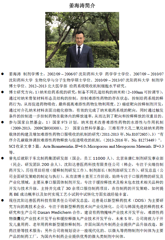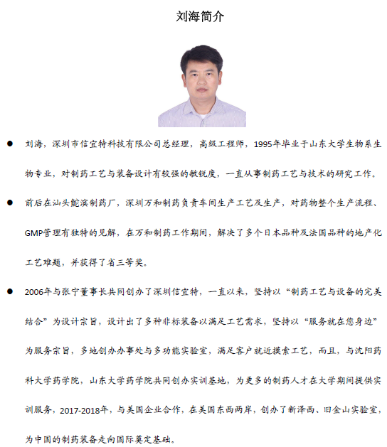 屆時,深圳信宜特為了回饋客戶,除了提供專業(yè)制藥裝備服務之外,特邀沈陽藥科大學崔福德教授,聊城大學生物制藥研究院院長韓軍教授,浙江大學藥學院李文龍博士,沈陽達善醫(yī)藥研發(fā)總監(jiān)姜海濤博士,北京中醫(yī)藥大學徐冰博士,長沙晶易醫(yī)藥研發(fā)總監(jiān)張海龍等數名國內專注于固體制劑工藝研究的實戰(zhàn)專家學者,為客戶面對面解答行業(yè)問題,專家將從粉體/顆粒學基礎理論介紹,到“一致性”工藝開發(fā)要領,最后實現穩(wěn)定可靠的產業(yè)化數據,多方面,深層次,以“高效仿制與產業(yè)化”為主旨進行探討,解讀及案例分析。歡迎制藥同仁踴躍報名參會。